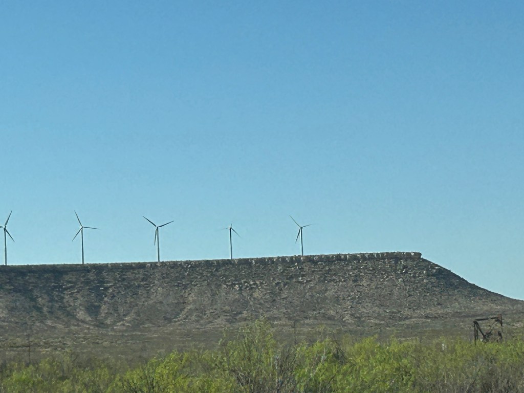 As we rolled along, I passed a few derelict “nodding donkey” oil wells that had stopped pumping long ago. On the ridge above them, was modern equipment producing energy from a source that will be never be exhausted. Here’s a photo I shot one-handed out the car window.
