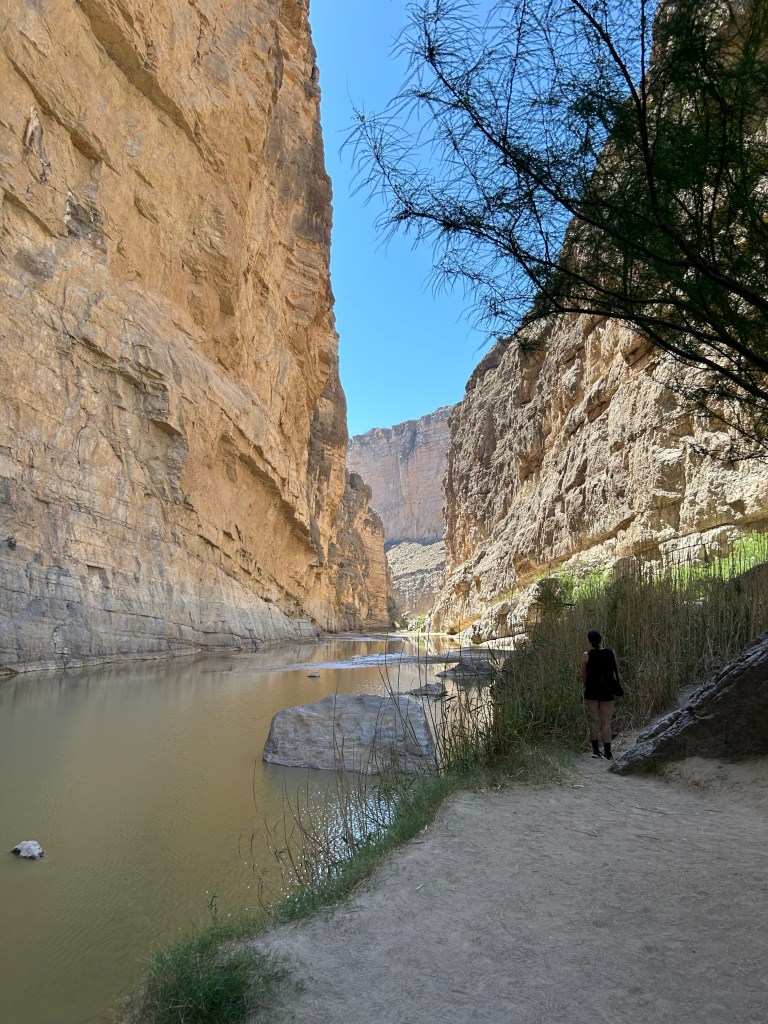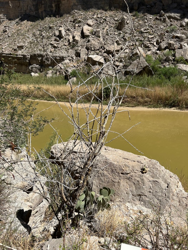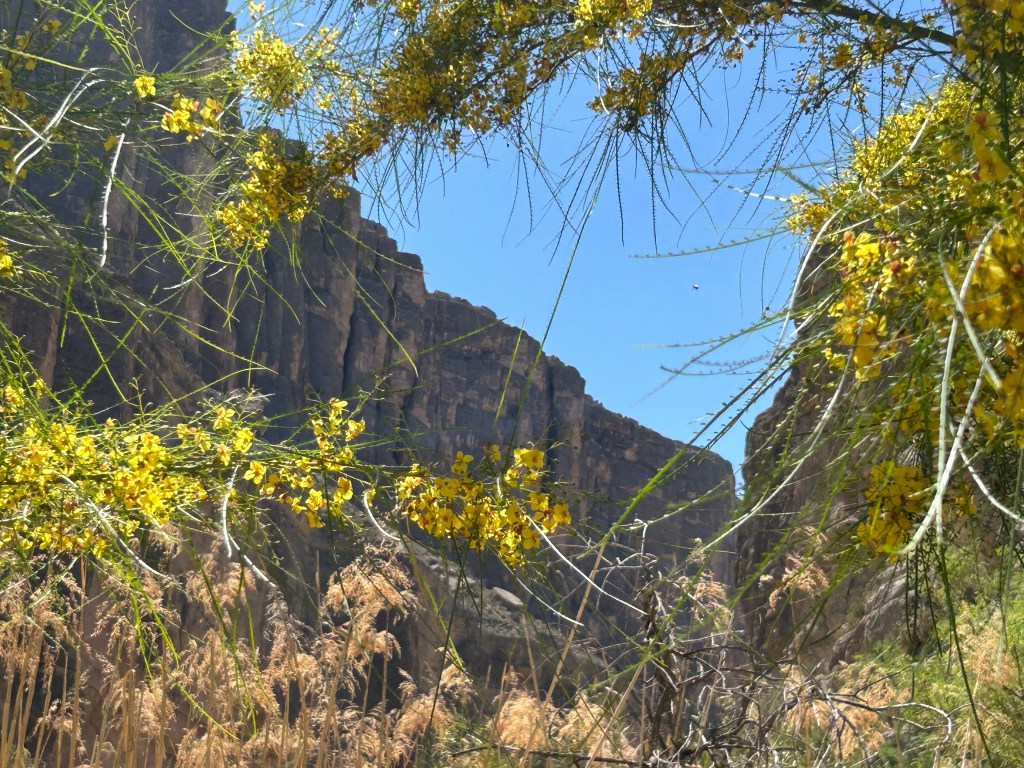 As we descended down toward the Rio Grande and Santa Elena Canyon, the temperature rose until Nell said that the external temps had hit 100 degrees. The parking lot was boiling. I trudged through the brush until I got to a dry wash and crawled up the riverbank to the trail that would take me into Santa Elena. There was a little brush providing bits of shade including some bits of Palo Verde covered in bounteous yellow blossoms. Here’s a photo: