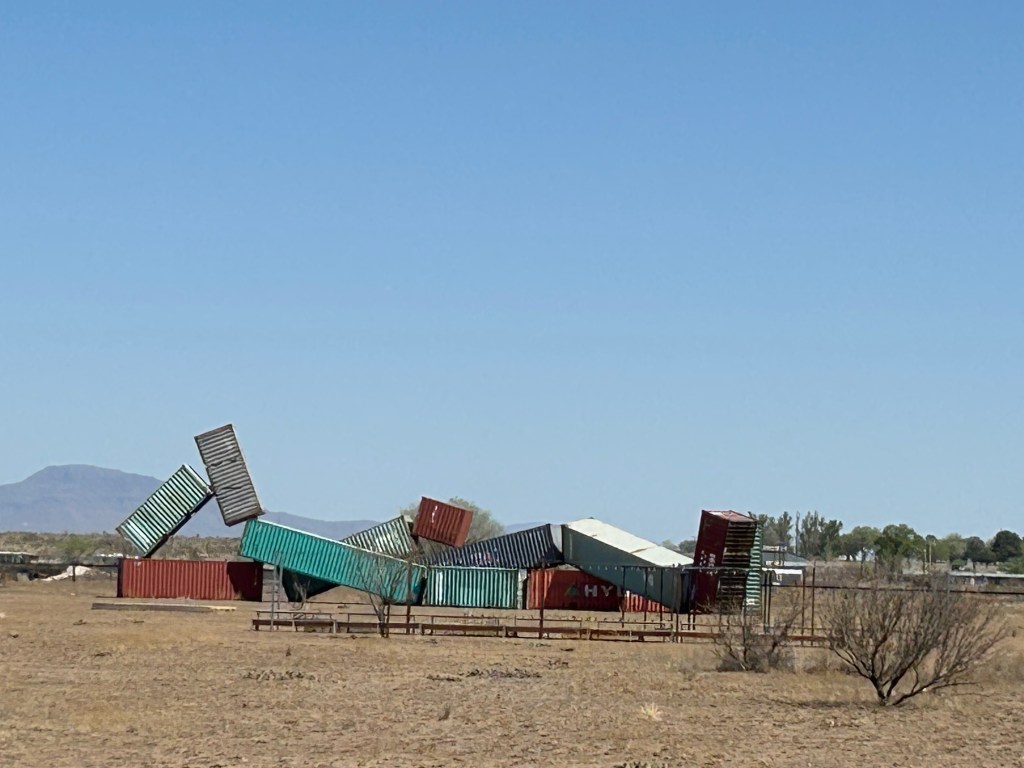 Rolling into town, I passed some shipping containers stacked at odd angles in a field on the edge of town. I snapped a photo and texted it to my sweetie with the question, “Art or Not?” What say you, gentle reader?